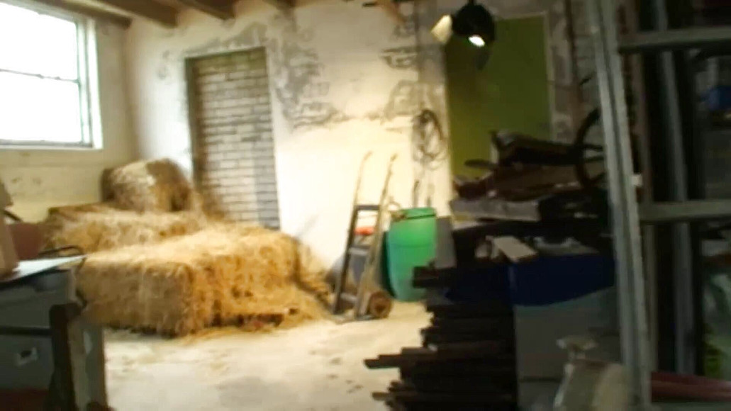 Gorgeous brunette babe with huge boobs is riding guy's big cock on the hay.