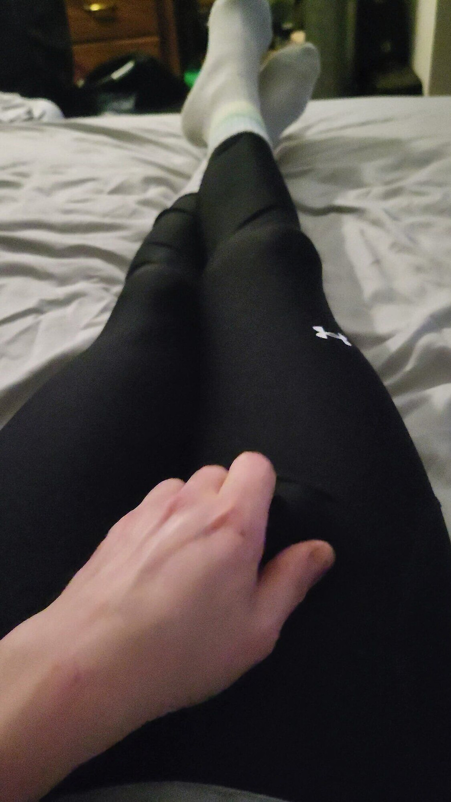 I cum on myself jerking off in black under armour leggings and white adidas crew socks. It felt so good... Pm me with and suggestions that you meay have. PS sorry for the inconsistent uploads.