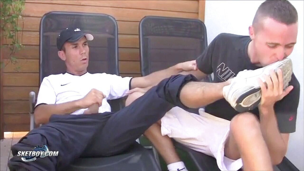 Julien jerks off on his terrace and not too far Loic is watching him. He's so horny he rushes on the hot guy's cock, sucks him off, and more at Sketboy.