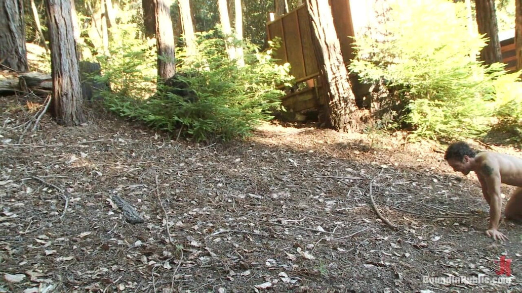 Josh West blindfolds and ties DJ to a tree in the woods. To make things more interesting, he puts an electric buttplug in DJ’s ass and plays with him using a remote control. Hikers find DJ naked and tied up, and they use the boy. They drag DJ into camp and turn him into a service slave. He is made to crawl around the campfire serving drinks and sucking cocks. The crowd tosses the camp whore into the hot tub, gang fuck him and spray his face and mouth with their hot cum. Satisfied, they make him crawl back into the woods where he belongs.