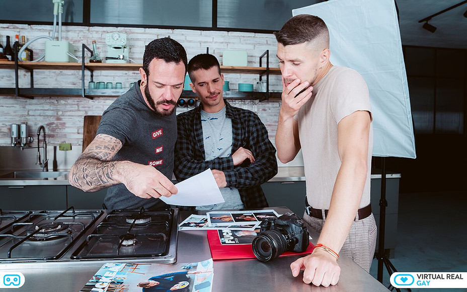 Dmitry Osten (POV) is the photographer who is going to take some pictures of the couple Tex Pat and Jericob. He tells them that they have to change their clothes in the back. He doesn’t want to be nervous so he tries not to look at their amazing bodies because they are very hot. They stay in front of the camera and Dmitry starts to take some pictures, but his mind starts to hallucinate: he imagines them naked and kissing each other. The passionate kisses drive them to a blowjob. They come to him and ask him if he is ok, because he stayed starring at them still. He tells them that he is fine, and that they have to go to the living room to take more pictures there. But the same happens to him: he starts to hallucinate again and this time he imagines a threesome! In his mind they will do some blowjobs to each other and they will have sex in different positions as cowboy, doggy or missionary, and they will do it in the most passionate and hot way . But at the end, he comes back to reality