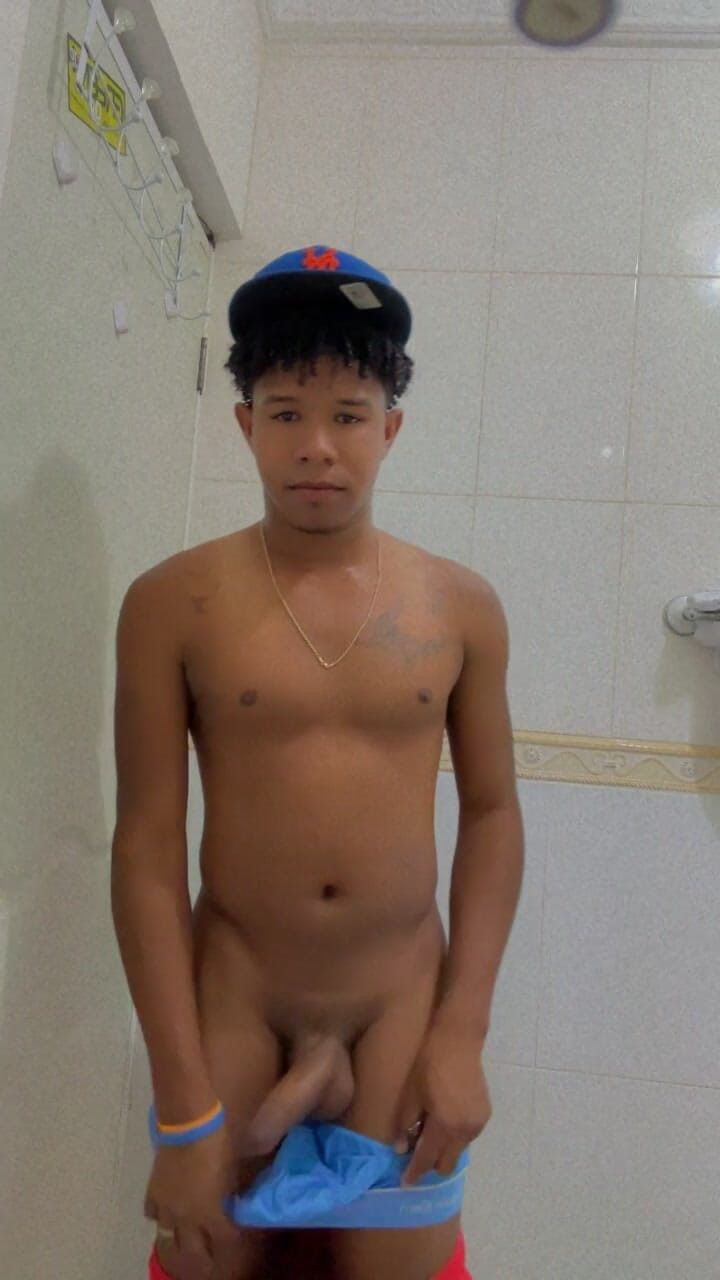 Muscular young man strips naked before the shower
