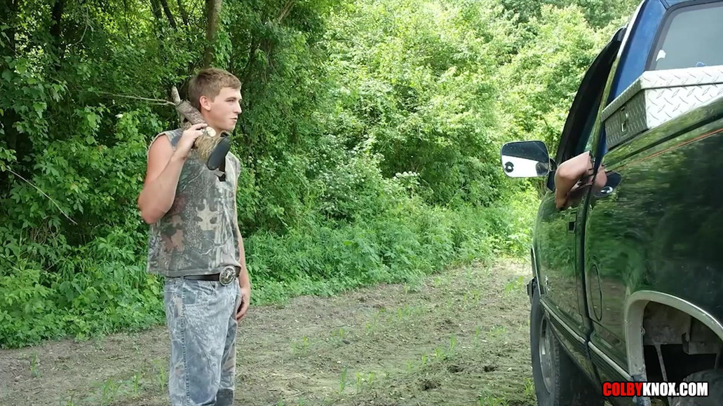 In this new ColbyKnox gay porn video release, Tyler Sky is out enjoying a nice day by hunting. The only problem is that he’s hunting on private property without permission. After walking out of the woods he sees a no trespassing sign and decides to shoot it. His next problem is that the property owner, Colby Chambers is driving through one of his fields and sees him shoot the sign. Colby approaches Tyler to ask him why he is on his land without permission. Tyler is dismissive at first but when the owner threatens to call the cops, he begins to cooperate more. He’s given an ultimatum to either have the cops called or suck Colby’s dick. Tyler decides it’s a better idea to work this out with the owner than to deal with the cops so he drops to his knees and gets ready to service that cock. Colby is a sexy farmer wearing jeans and boots and unzips his pants exposing his thick seven inch cock. He leans back against the truck and Tyler gets to work putting that thick shaft in his mouth and su
