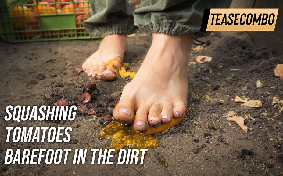 The video captures a close-up of a barefoot girl squashing ripe tomatoes in the dirt, with a focus on her feet as they press down on the soft fruit. Her bare toes curl and flex as the tomatoes burst, releasing a splash of red juice that stains the ground. The dirt beneath her feet is slightly muddied, enhancing the raw, earthy feel of the scene. The camera lingers on her feet, emphasizing the beauty of her feet and the squish of the tomatoes as they are crushed underfoot.